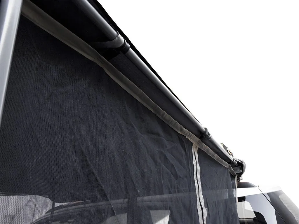 Moskitiera montowana do markizy ochroni przed insektami w trakcie biwaku w ciepłe dni. Wystarczy przymocować moskitierę do słupków pionowych i poziomych poprzeczek markizy, a następnie zamocować śledziami do podłoża. Bardzo szybka i łatwa w montażu i demontażu. Zawiera 4 ściany i sufit. Zamek błyskawiczny na każdej ścianie nie przylegającej do samochodu, umożliwia wejście/wyjście. Kolejny zamek błyskawiczny na całej wysokości ściany przylegającej do samochodu, umożliwia dostęp do auta.