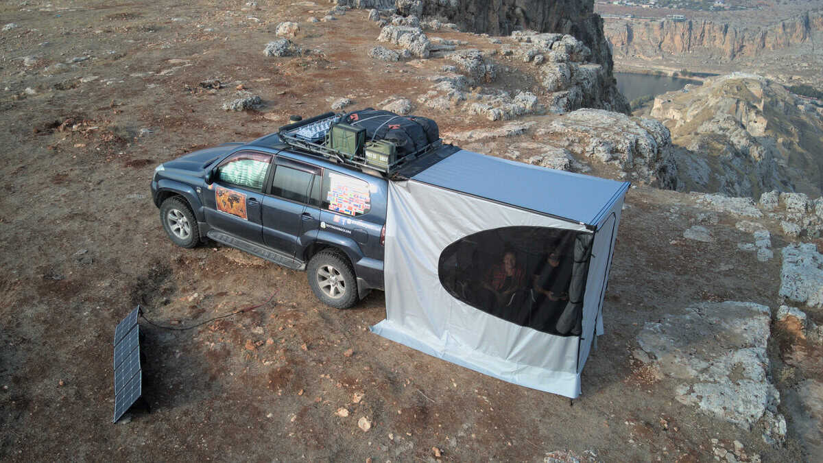 Ściany boczne zintegrowane są bezpośrednio z konstrukcją markizy. Wyposażone są w przezroczyste okna, które można rozpiąć za pomocą zamka błyskawicznego, a wbudowane moskitiery i drzwi zapewniają swobodny dostęp i ochronę przed owadami. Panele te, w połączeniu z markizą i namiotem dachowym, pozwalają stworzyć przestronne i komfortowe miejsce wypoczynku, idealne na każdą pogodę. Zapewniają one schronienie przed słońcem, deszczem i wiatrem, jednocześnie umożliwiając podziwianie otaczającej przyrody.